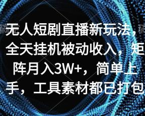 无人短剧直播新玩法,全天挂机被动收入,矩阵月入3W+,简单上手,工具素…